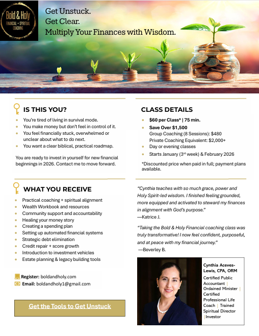 - A 50-minute private session for financial and/or spiritual coaching.